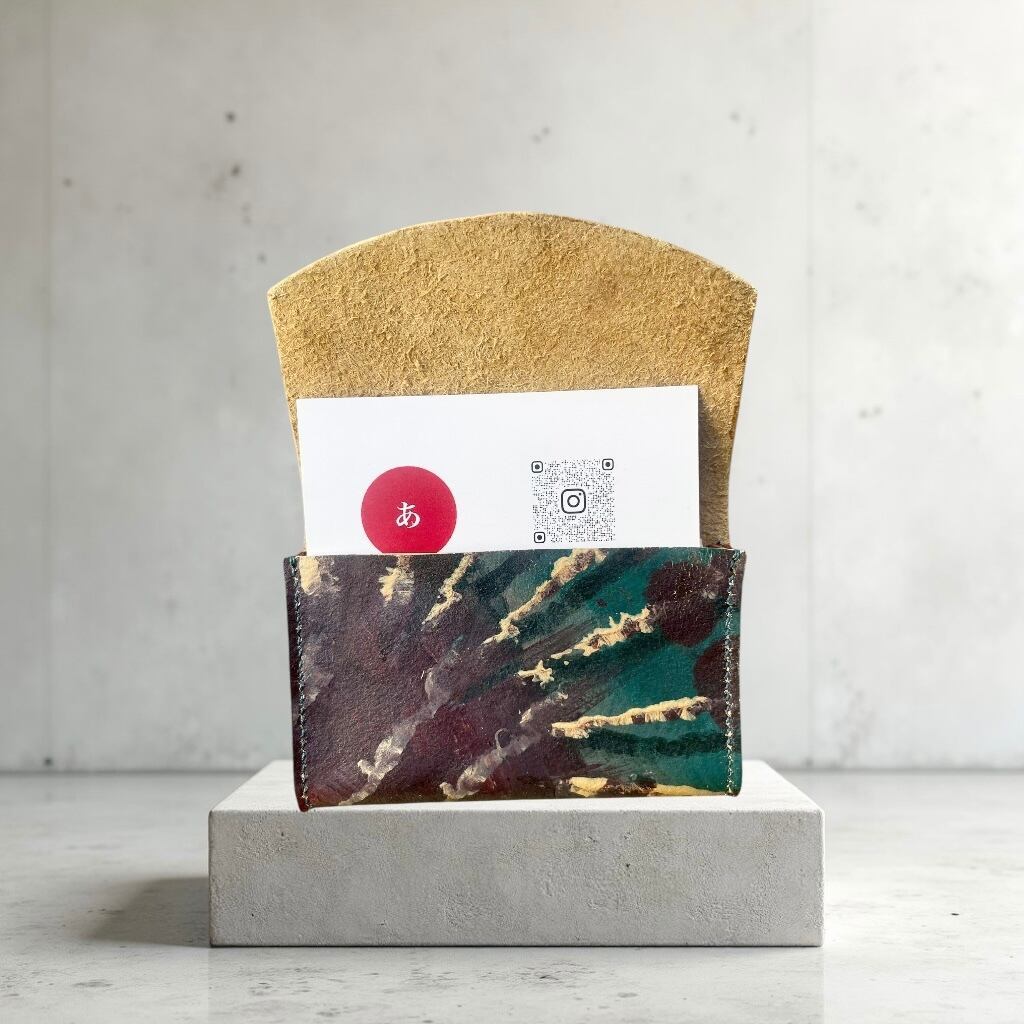 We commissioned Ouki to paint a picture on the surface of the leather and then tailor a business card holder.